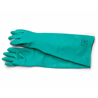 Schutzhandschuh mit hervorragender Abrieb- und Reissfestigkeit, chemische Beständigkeit, extra lang, mit Hammerschlagfinish. Stärke: 0,56 mm, Länge: 455 mm, Verpackungseinheit: 1 Paar. EN388 (4102), EN 374-2, EN374-3 (AKL)