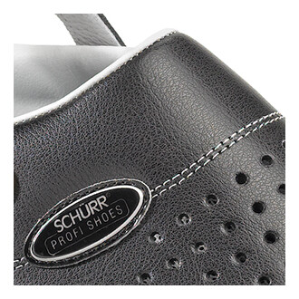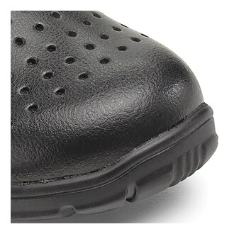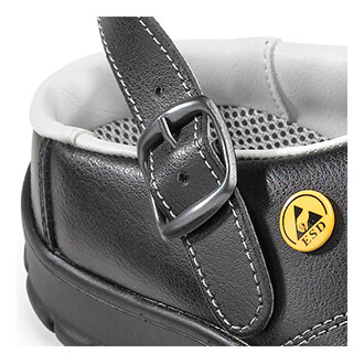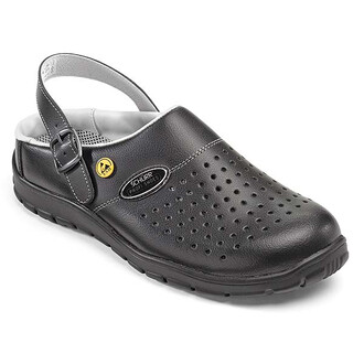 Sportliche ESD Pantolette perforiert, Obermaterial aus Mikrofaser, schwarz, nach Vorne klappbarer Fersenriemen, weiches DRY-TEC Textilfutter, bequeme PUR Einlagesohle, rutschhemmende PUR-Sohle, antistatisch, ESD Schutz max. 35 M-Ohm.